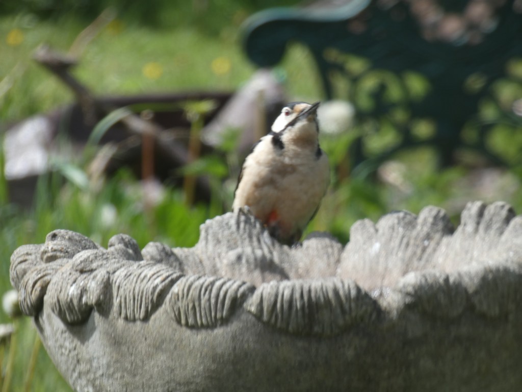 We have at least three Greater Spotted Woodpeckers who visit every day but taking pictures of them is very difficult. As soon as you move or open the window they are gone so today I resorted to shooting through the kitchen window. The results are patchy. The kitchen window has many small panes with old glass in them which is notorious for not being flat. Nevertheless, I tried and got this shot of a woody sat on the edge of a birdbath having just had a drink.